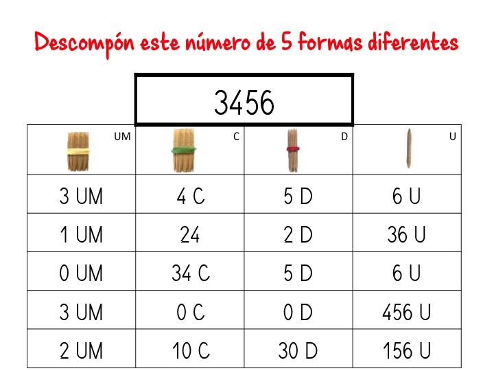 Una vez que nuestros alumnos dominan la descomposición numérica tradicional, es decir, la descomposición en unidades, decenas, centenas,… de un número, en muchos casos comete fallos al confundir el valor de posición de la cifra con el número de esas unidades. Por ejemplo si se le pregunta ¿cuántas decenas tienen el 456 ?, es común que conteste 5 en lugar de 45.