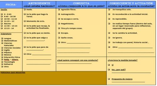 Hemos adaptado este sencillo registro de conductas, realizado por Almudena G. Negrete en su blog http://maestraespecialpt.com/