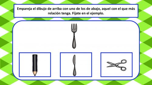 A continuación os proponemos una divertida actividad para trabajar con nuestros peques la estimulación cognitiva a través de la categorización y la relación que puede existir entre los dibujos que se presentan. Para ello el alumno deberá seleccionar de tres opciones el dibujo que tenga más relación con el que aparece arriba, se pretende que a través de recursos como las analogías los alumnos sean capaces establecer la relación existente entre dichas imágenes. Ejemplo: «Perro es a hueso, como gato a …»