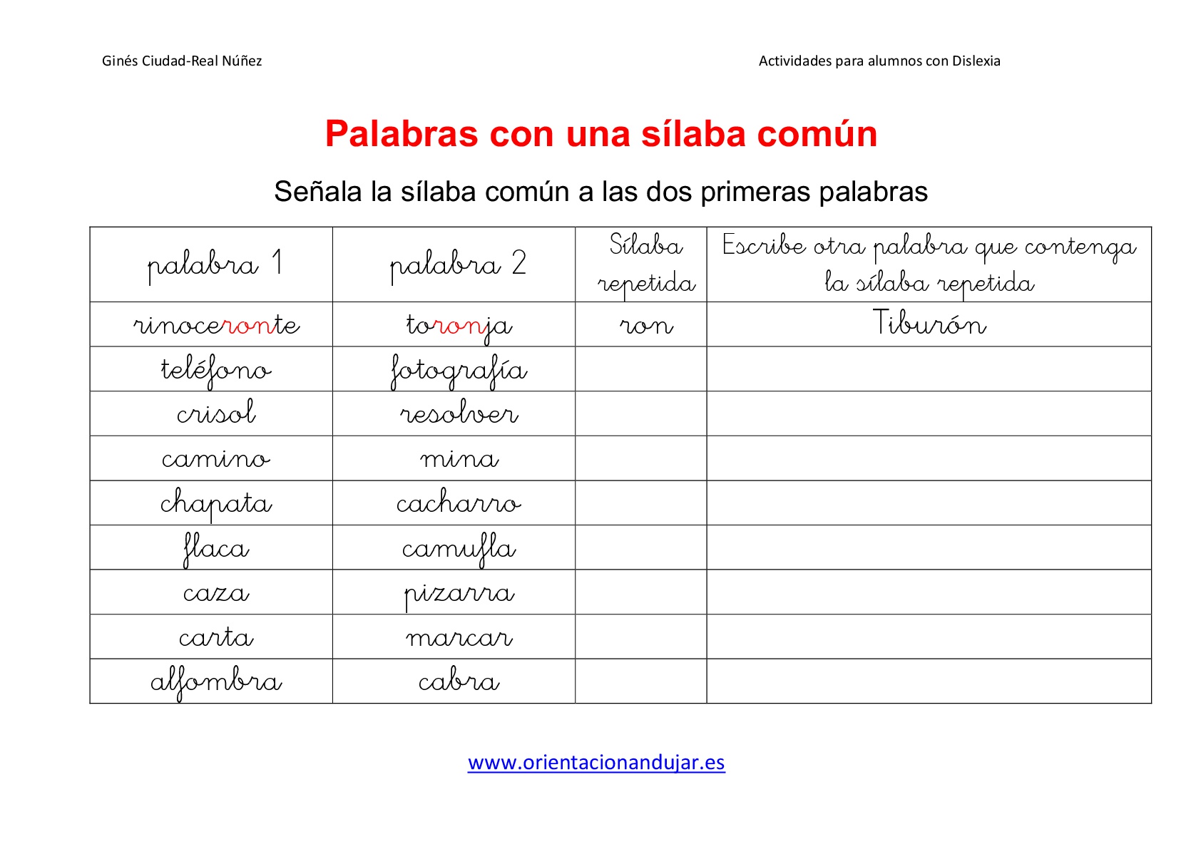 Actividades dislexia Palabras con una sílaba común Señala la sílaba común a las dos primeras palabras5