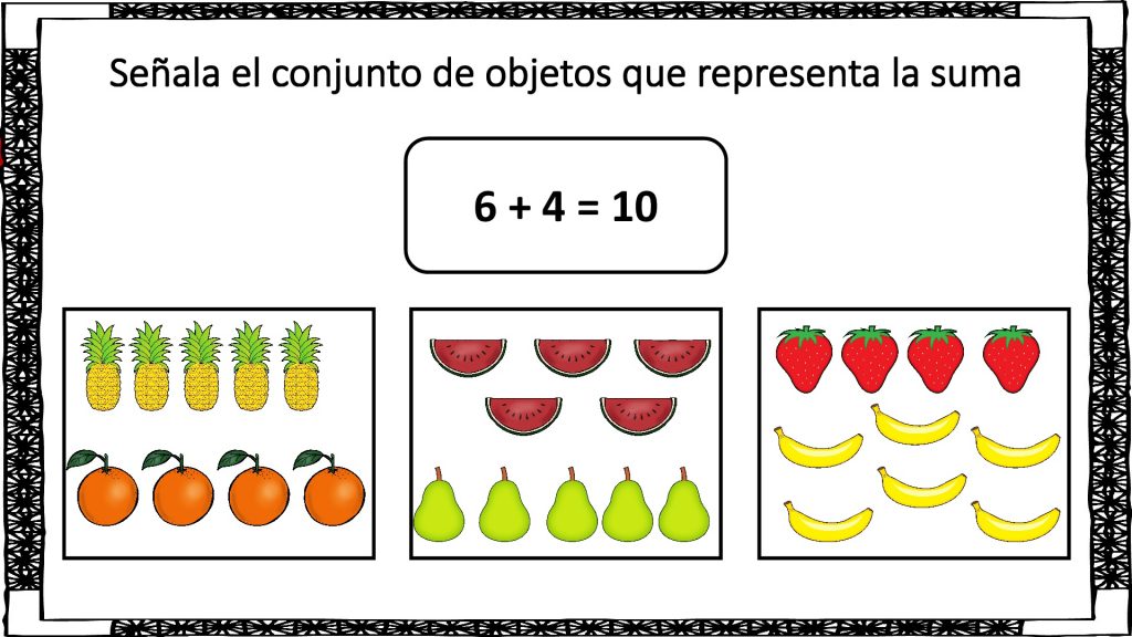 En la siguiente actividad matemática los alumnos deben señalar cual de las tres opciones representa graficamente a través de divertidos dibujos la suma que aparece en el recuadro.