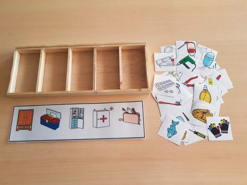Material manipulativo tipo TEACCH para trabajar el léxico, la semántica y el razonamiento lógico identificando y asociando los lugares donde se guardan distintos objetos, vestidos, medicinas, herramientas y alimentos. Otro fantastico material de Arasaac que os compartimos.
