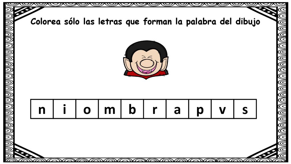 Hoy os traemos un ejercicio de lectoescritura para trabajar el vocabulario de halloween; en el que hay que colorear solo las letras que forman las palabras del dibujo que aparece.