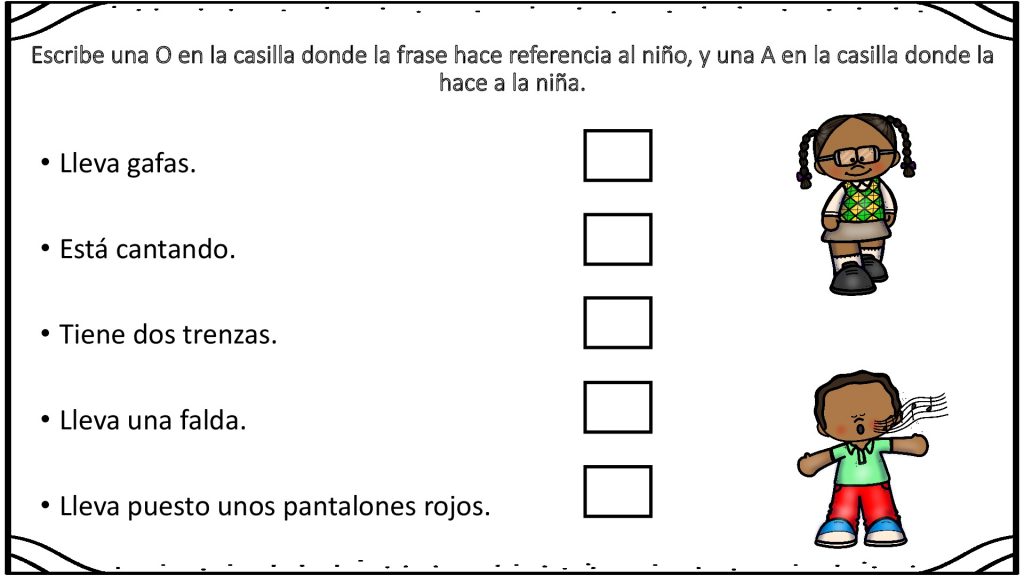 Hoy os traemos unas divertidas fichas en las que trabajaremos la atención a la vez que la comprensión lectora a partir de dibujos, sólo hay que marcar con una O o con una A, en función de si la frase hace referencia al dibujo del niño o de la niña, respectivamente.