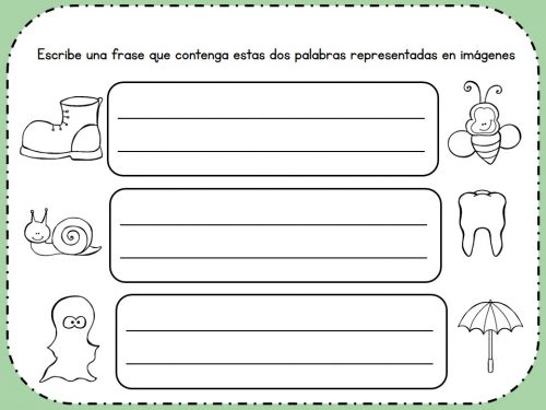 Se le pide a un niño que escriba una frase teniendo en cuenta las dos imágenes de la ficha teniendo en cuenta que entre las dos palabras hay cierta diferencia para facilitar la escritura creativa del alumno.