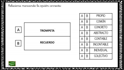 A continuación, os dejamos un ejercicio para trabajar y aprender a clasificar las palabras según la clase de sustantivo que sea. El ejercicio consiste en que una vez dada dos palabras, hay que marcar en la tabla A ó B, según corresponda a una palabra o a otra.