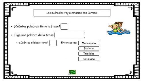 A continuación, os comparto un ejercicio de lengua para analizar la estructura de las palabras que forman una frase. Con esta actividad, trabajaremos la conciencia silábica, ésta se enmarca dentro de la conciencia fonológica, y hace referencia a la capacidad de comprender que el discurso hablado se divide en unas unidades sonoras más pequeñas que son las sílabas, así como la habilidad para manipularlas.