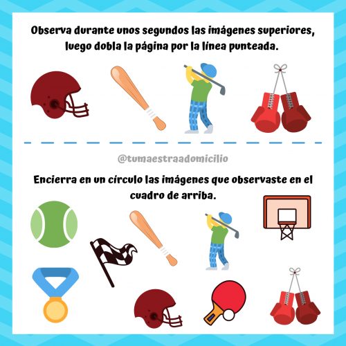 Vamos a doblar la página por la mitad o tapamos la parte inferior para evitar distracciones adicionales. El niño deberá centrarse solamente en las imágenes que observa en la parte superior, se las mostramos de 30 segundos a un minuto y tapamos o doblamos. Luego pasamos a la parte de abajo en donde deberá encerrar en un círculo únicamente las imágenes que recuerda haber visto.