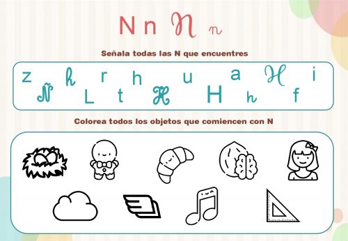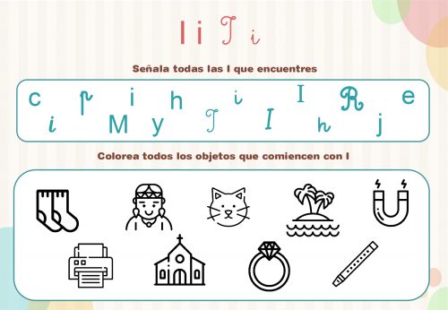 En cada ficha deberán reconocer y señalar las distintas letras y colorear los objetos que comiencen o contengan dicho grafema.