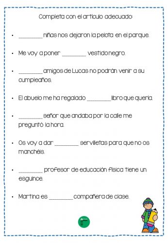 En la siguiente actividad, el alumno deberá completar las frases con el artículo adecuado.