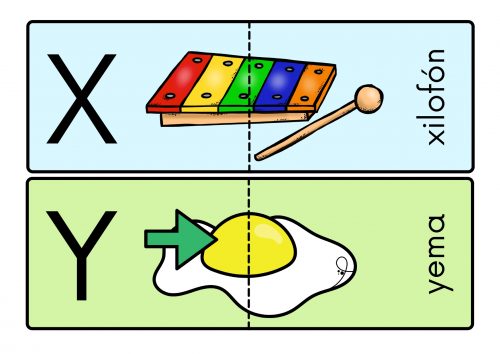 Contienen dos piezas que se unen por la imagen. El resultado del puzzle completo es la letra, la imagen que contiene su inicial y la palabra.