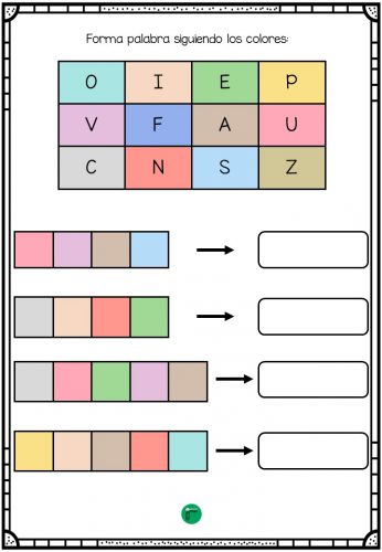 No es la primera vez que comparto este tipo de tareas en el blog; ya que se trata de una actividad muy completa y original para trabajar diferentes aspectos en un mismo ejercicio; como la lectoescritura, la conciencia fonológica y la atención, tanto sostenida como selectiva. El alumno deberá formar una palabra siguiendo el código de colores.