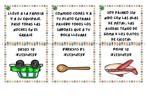 Las tarjetas están diseñadas para que, al doblarlas al medio, de un lado se encuentre la adivinanza y del reverso, la respuesta.