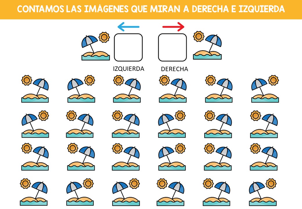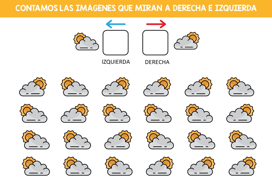 El objetivo de estas fichas es que los niños y niñas puedan identificar y diferenciar la dirección en la que miran las imágenes presentadas. A través de modelos visuales, los alumnos deberán contabilizar cuántas de ellas miran hacia la derecha y cuántas hacia la izquierda.