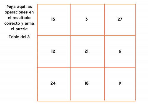 Se debe armar según las indicaciones. Cada pieza del puzzle tendrá una operación detrás y se deberá pegar en el resultado correcto.