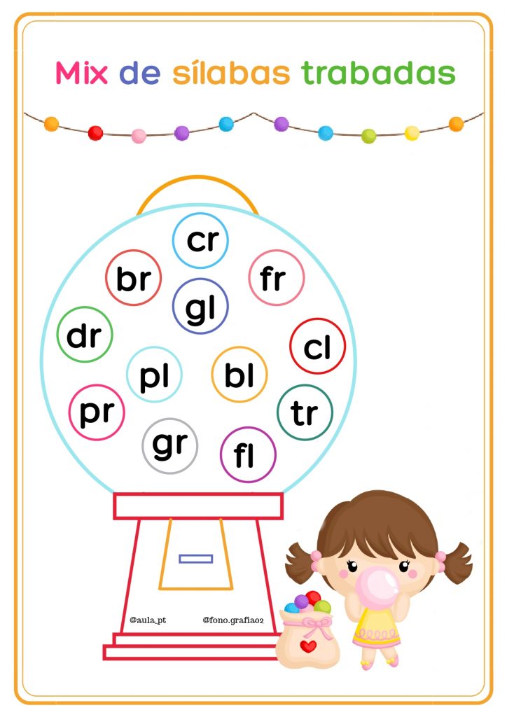 Consiste en 4 diseños distintos de máquinas de dulces que contienen los grupos consonánticos (br, bl, pr, pl, gr, gl, fr, fl, cr, cl, dr, tr) y 48 dulces con imágenes que comienzan o contienen sílabas trabadas. ⠀