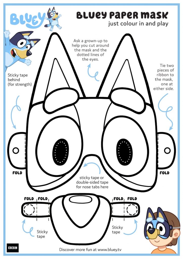 Comienza imprimiendo una plantilla de la máscara de Bluey en cartulina o papel resistente. Luego, decora la máscara con colores vibrantes, como el azul y el blanco, y agrega los detalles característicos de Bluey, como sus orejas y su sonrisa traviesa. Asegúrate de recortar agujeros para los ojos y hacer una abertura para la nariz. ¡Listo para desfilar como Bluey en el carnaval! -