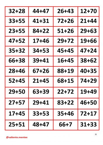 Páginas de la 32 a la 37: Aquí también hay tres modelos de ejercicios, con diferentes niveles de dificultad (el rojo es el más difícil, el azul tiene una dificultad media y el verde es el más fácil). Hay dos maneras de llevarlo a cabo: tras imprimir las hojas, puedes dejar o la parte de los números solos o la de las sumas entera, sin recortar cuadro por cuadro y si recortar cada cuadro de la otra o al revés, para que los residentes pongan las recortadas encima del cuadro correspondiente de la que no se ha recortado de manera individual.