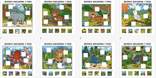 - Ejercicios de Pegado: Después de recortar y encontrar, los niños pueden pegar las figuras en lugares designados, lo que les ayuda a entender la relación espacial y la coordinación.