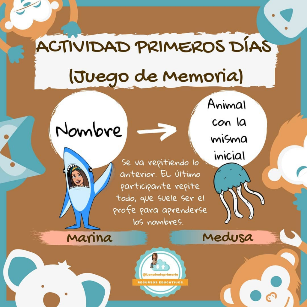 Se trata de que cada alumno o alumna diga su nombre y un animal que empiece por su inicial, con la dificultad de que es un juego de memoria, y debemos de repetir lo de los anteriores, por lo tanto a la persona que le toque en último lugar, lo tiene muy complicado, y esa persona soy YO. Otra de las cosas que les encanta y causa gran expectación es ver si soy capaz de decirlos todos, y no se me suele dar mal, aunque he de decir que me ayudan un poco.