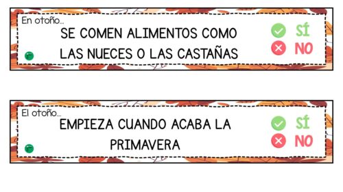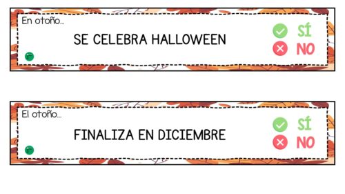 Divide a los estudiantes en equipos y presenta una declaración a la vez. Cada equipo debe discutir y decidir si creen que la declaración es verdadera o falsa. Después, cada equipo debe revelar su respuesta. Después de que se revelen las respuestas, explora las declaraciones una por una y discute la razón detrás de su veracidad o falsedad. Esto fomenta el pensamiento crítico y la reflexión sobre el otoño. Además, os adjuntamos la plantilla de las tarjetas, para que podáis ampliar el juego o adaptarlo a las necesidades de vuestro grupo.