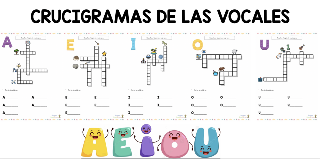 El material que os comparto a continuación, es ideal para que los más pequeños refuercen su conocimiento de las vocales y enriquezcan su vocabulario de una manera lúdica y estimulante. Se trata de crucigramas diseñados específicamente para que los niños encuentren y completen palabras que comienzan por vocales (a, e, i, o, u). Esta actividad permite que los niños trabajen el reconocimiento de las vocales en diferentes palabras, además de afianzar su habilidad lectoescritora a través de una actividad que fomenta tanto el pensamiento crítico como la asociación de ideas.
