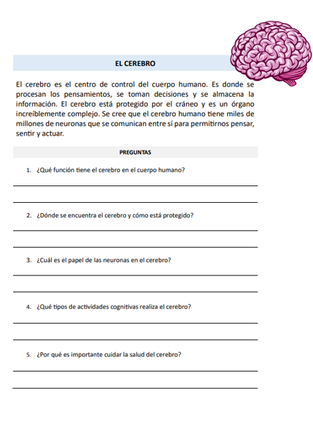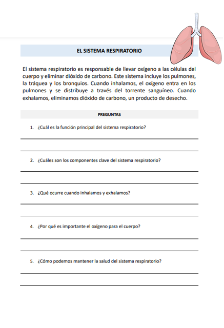 Estas lecturas están diseñadas para hacer que los estudiantes comprendan de manera clara y sencilla el funcionamiento del cuerpo humano, reforzando su capacidad de análisis y memoria. Las preguntas que acompañan cada lectura fomentan la reflexión y ayudan a los estudiantes a consolidar sus conocimientos.