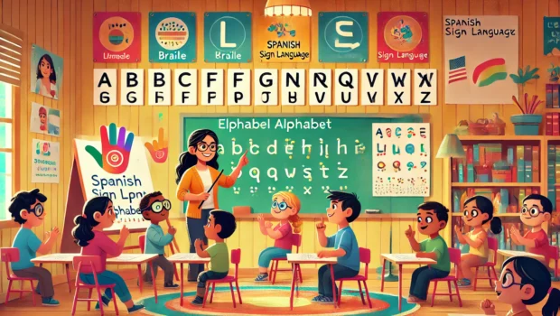 DALL·E 2024-11-11 12.58.28 – A Pixar-style educational illustration showing a classroom setting focused on inclusivity, featuring large alphabet charts with Braille and Spanish Si Publicado por orientacionandujar el 11 noviembre, 2024
