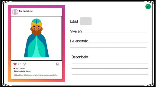 Esta actividad consiste en una serie de fichas diseñadas para parecer perfiles de Instagram de personajes icónicos de Navidad, como Papá Noel o el Grinch, entre otros. En cada ficha, los alumnos podrán inventar y completar información sobre estos personajes, usando su imaginación y creatividad para crear sus biografías, publicaciones, seguidores, e incluso comentarios en las publicaciones.