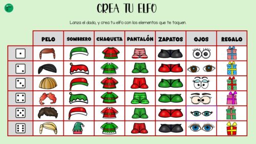 El objetivo de la siguiente actividad es sencillo pero emocionante. Los alumnos lanzarán un dado y, según el número que les toque en cada tirada, deberán añadir un elemento específico a su elfo. Estos elementos incluyen el pelo, la chaqueta, los zapatos, el sombrero, los ojos, ¡y mucho más! Cada tirada les llevará a crear un personaje navideño totalmente único.