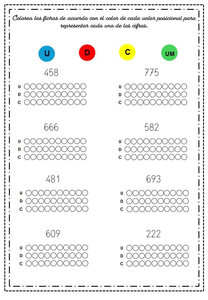 - Fichas para colorear: Actividades diseñadas para identificar el valor posicional de números hasta 3 cifras.