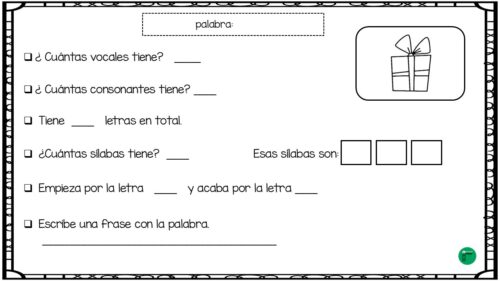 A continuación, te compartimos un recurso educativo ideal para trabajar el vocabulario navideño de forma divertida y significativa. A partir de imágenes que representan palabras típicas de esta época (como «estrella», «regalo» o «muñeco de nieve»), los alumnos deberán analizar cada término indicando el número de letras, el número de sílabas, la letra inicial o incluso escribiendo una frase relacionada. Esta actividad es una excelente manera de fortalecer la conciencia léxica, silábica y fonológica, fomentando al mismo tiempo la creatividad y el uso del lenguaje. Además, la temática navideña añade un toque motivador, convirtiendo el aprendizaje en un juego perfecto para estas fechas tan especiales.