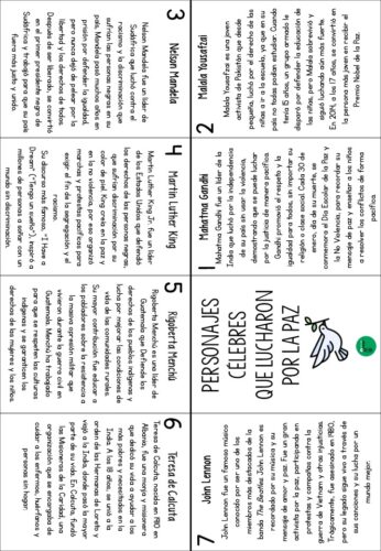 Hoy os quiero compartir un recurso educativo muy especial: un mini libro que reúne biografías de personajes históricos clave que han luchado por la paz en todo el mundo. Cada página de este mini libro está dedicada a un líder que promovió la justicia, la igualdad y la no violencia, como Mahatma Gandhi, Martin Luther King Jr., y Nelson Mandela, entre otros. El formato de mini libro es ideal para los estudiantes, ya que facilita la lectura y comprensión de estos grandes ejemplos de humanidad en un formato compacto y accesible. Su tamaño pequeño permite que los niños se sientan motivados a leerlo de principio a fin, mientras que las biografías breves y claras les permiten conocer los logros de cada figura histórica sin sentirse abrumados.