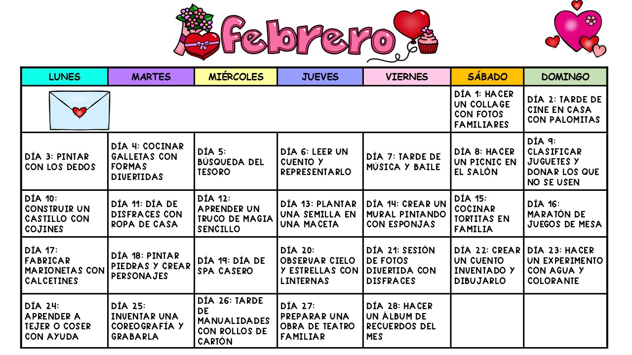 Calendario actividades divertidas para hacer en familia y clase febrero 2025