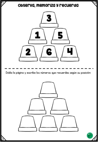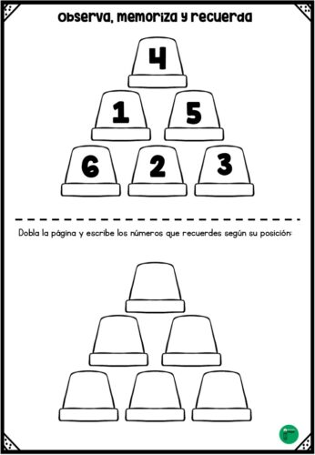 El objetivo principal de este ejercicio es mejorar la memoria visual a corto plazo. A través de la observación de una secuencia de números dispuestos en forma de pirámide, los participantes tendrán que memorizar la disposición y luego reproducirla correctamente, colocando cada número en su lugar adecuado de la pirámide.