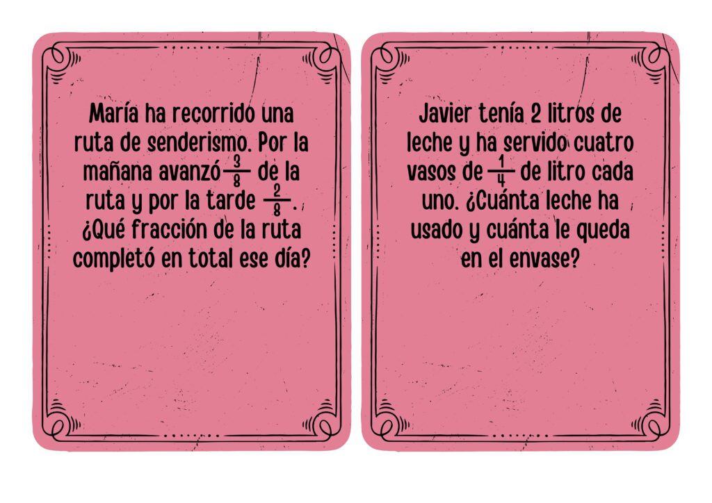 En las cartas del signo de interrogación los peques tendrán que realizar ejercicios como suma, resta, comparación, representación, cálculo de la fracción de un número, lectura y escritura de fracciones… etc.