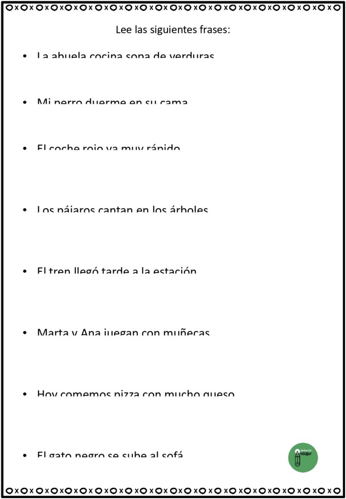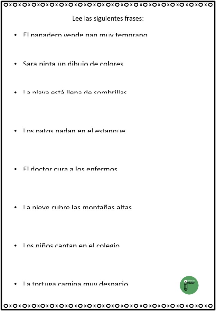 Hoy compartimos una ficha de frases partidas pensada para trabajar la lectura en los primeros cursos de Primaria. Se trata de oraciones sencillas y cotidianas en las que solo se muestra una parte de las letras, de manera que los niños y niñas deben deducir el resto de la frase. Con esta dinámica se potencia la atención, la percepción visual y la comprensión lectora, al mismo tiempo que se convierte en un reto divertido y motivador.