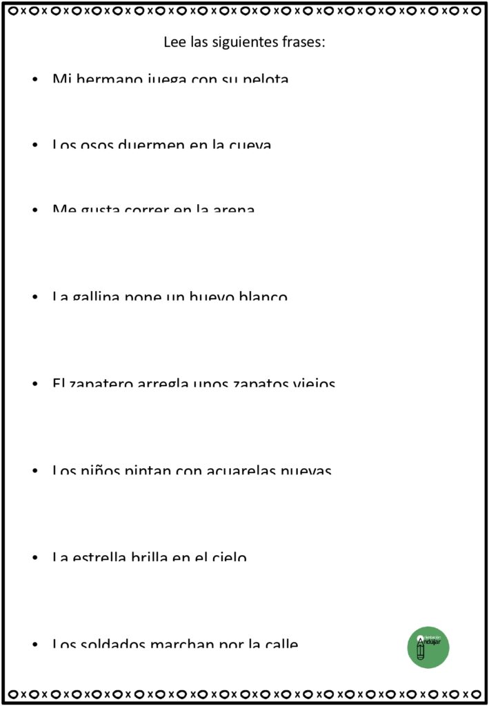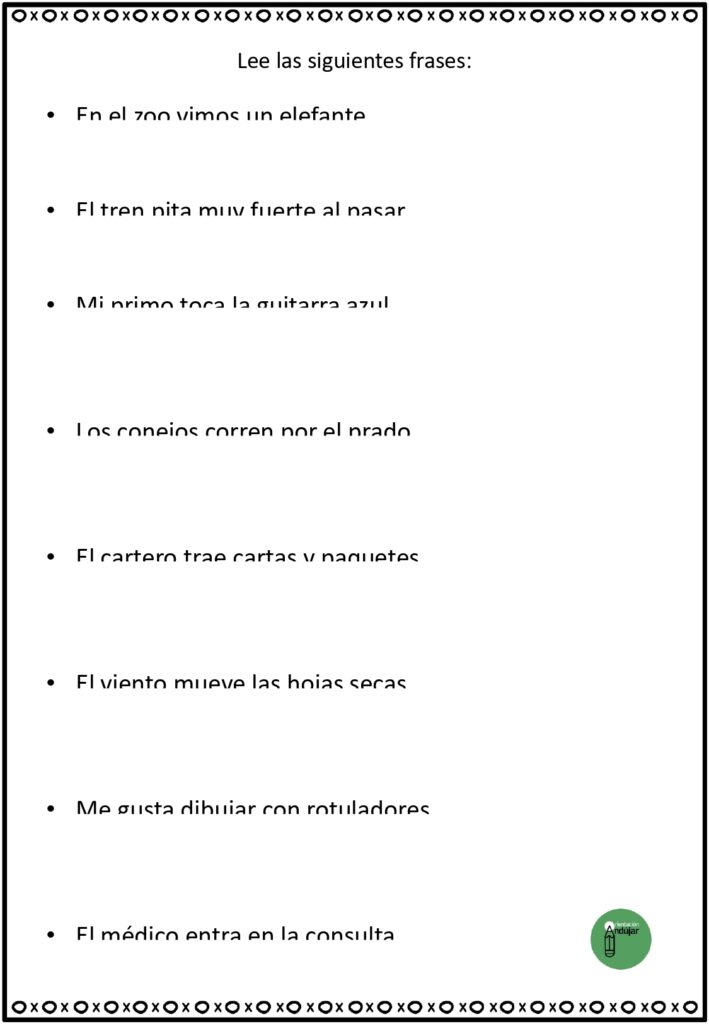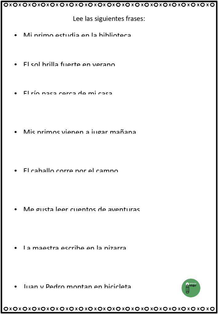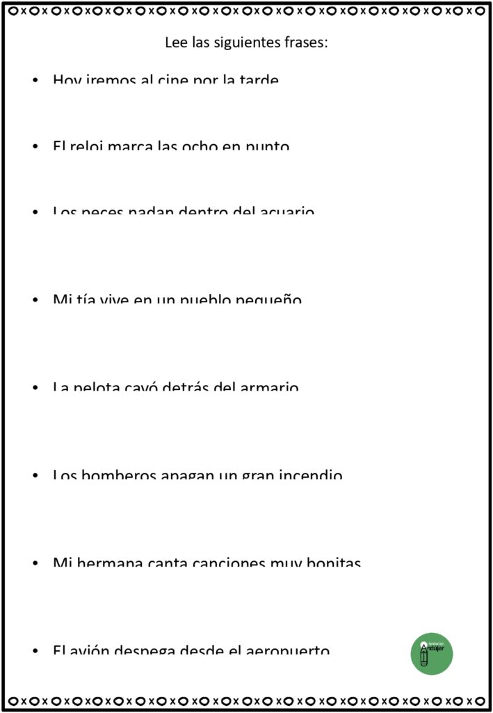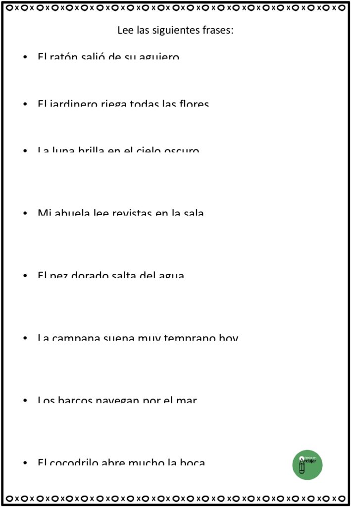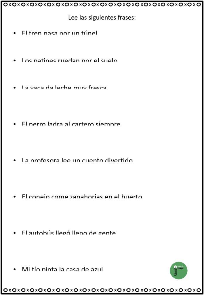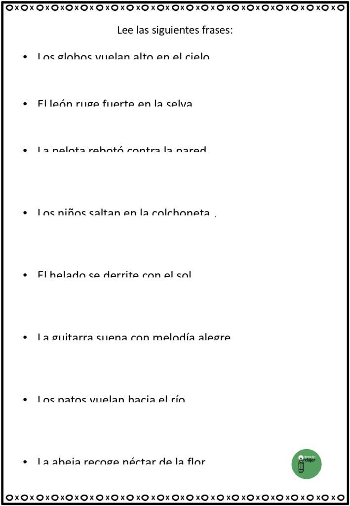 Este recurso incluye varias frases adaptadas al nivel de los más pequeños y resulta ideal tanto para el aula como para casa. Puede utilizarse de forma individual, en parejas o como juego grupal, reforzando la velocidad lectora y la capacidad de deducir palabras a partir de las pistas visuales. Una propuesta sencilla, original y muy útil para despertar el interés por la lectura.