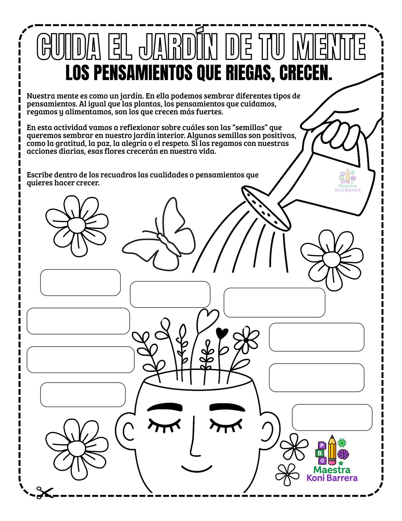 Hoy quiero compartirte una actividad reflexiva y creativa para trabajar con tus alumnos. Con ella podrán identificar cuáles son los pensamientos positivos que quieren sembrar en su vida (como gratitud, respeto, paz o alegría) y descubrir qué acciones pueden hacer para “regar” esas semillas cada día.