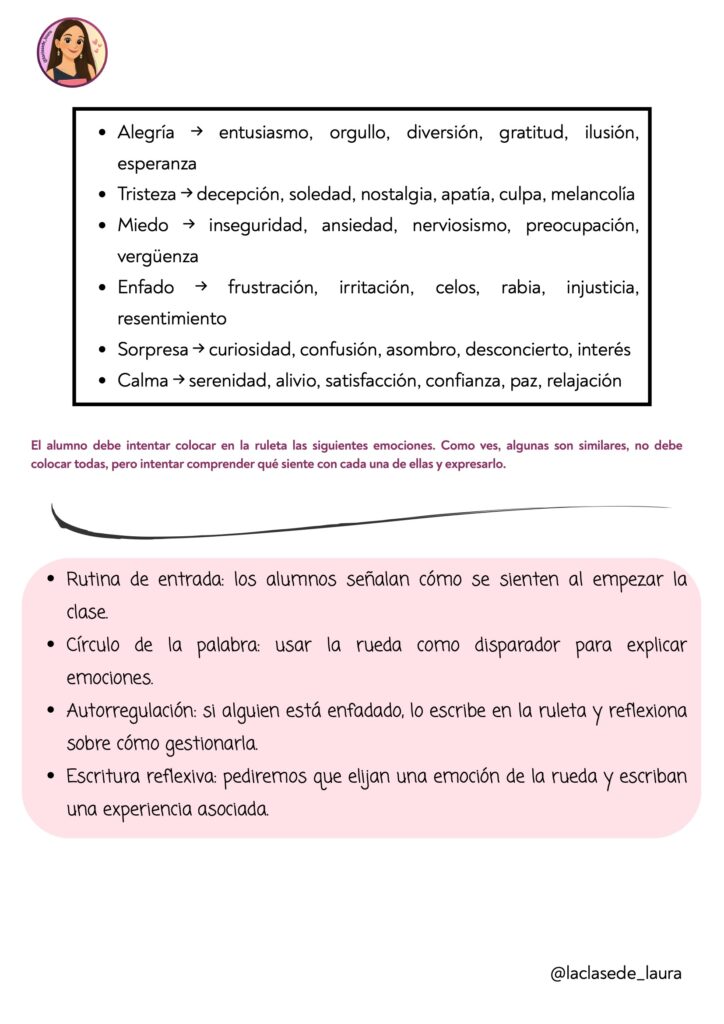 Ruleta de las emociones: trabajar las emociones principales (alegría, tristeza, miedo, enfado, sorpresa, calma) con rutinas de entrada, autorregulación y escritura reflexiva.