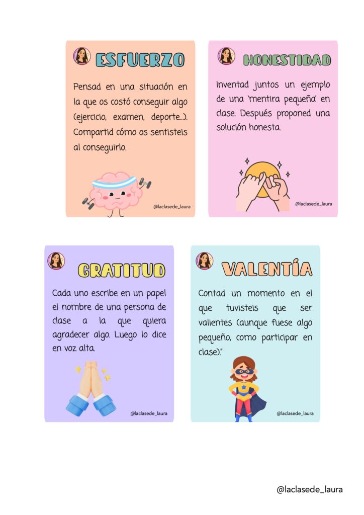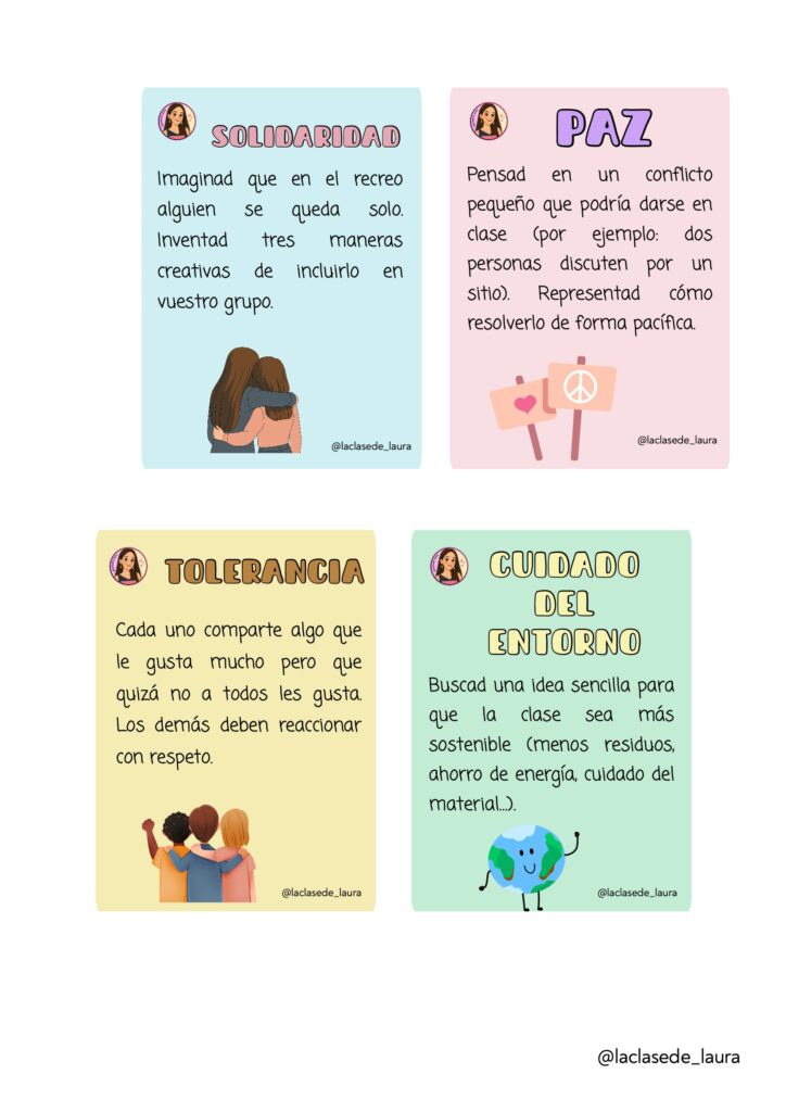 Tarjetas de valores: actividades sobre solidaridad, paz, gratitud, valentía, esfuerzo, honestidad, justicia, superación personal, creatividad, escucha activa.