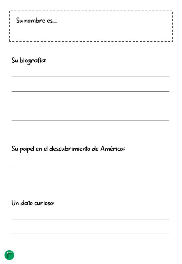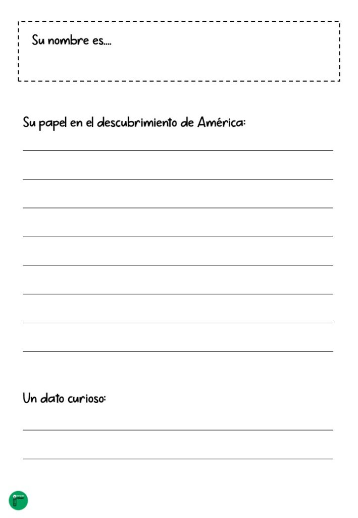 Hemos preparado una plantilla lista para imprimir, donde cada alumno podrá completar la información de los personajes más importantes del descubrimiento de América. La idea es que los estudiantes investiguen y busquen los datos, desarrollando habilidades de búsqueda, síntesis y creatividad.