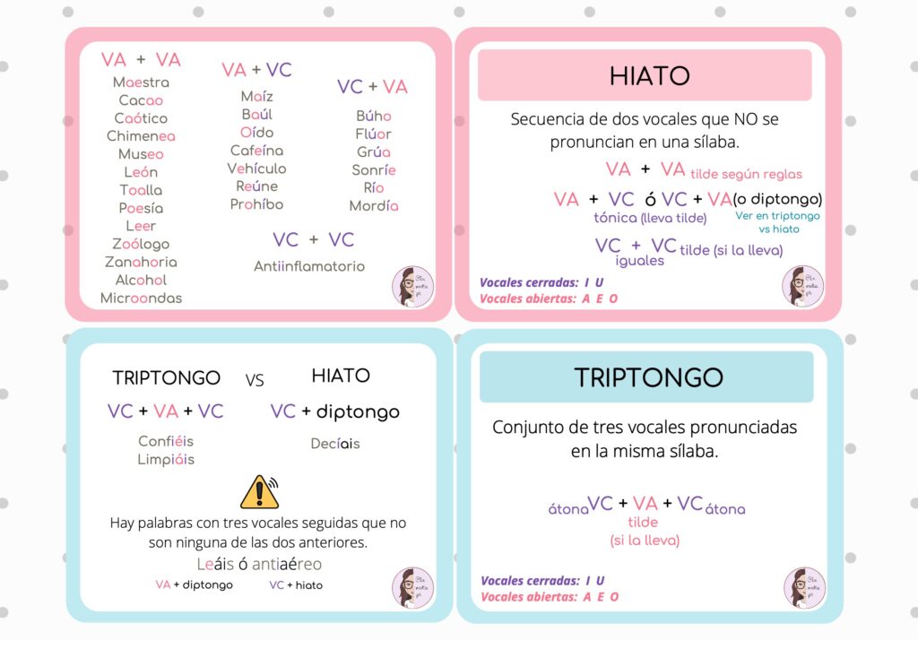 Ejemplos prácticos de diptongos, hiatos y triptongos.