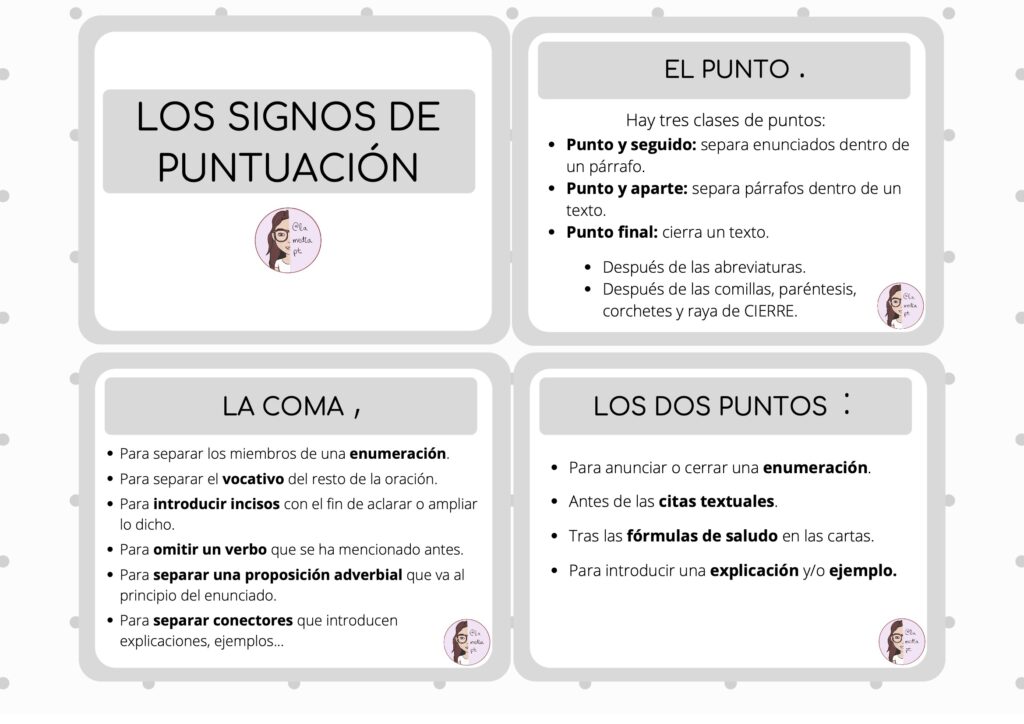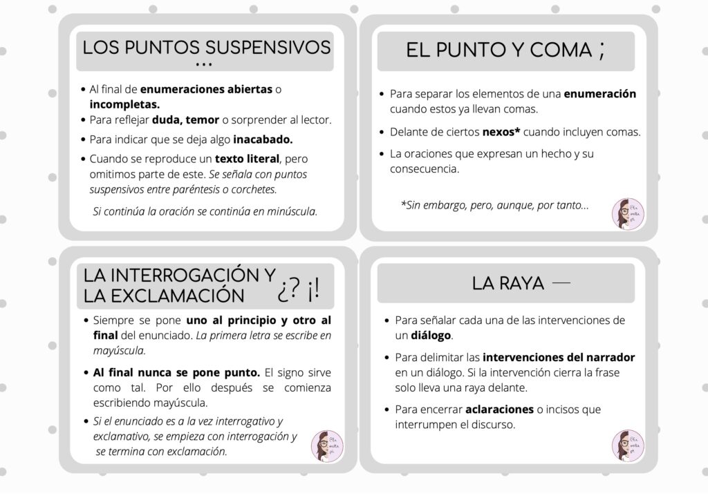 Reglas de uso de los signos de puntuación: punto, coma, punto y coma, puntos suspensivos, interrogación, exclamación, guion, paréntesis, comillas y raya.