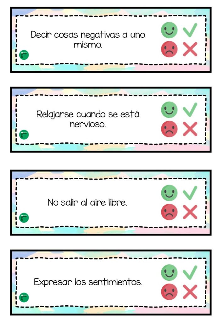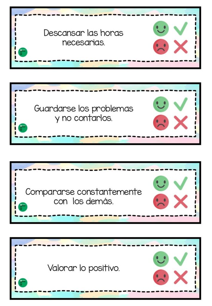 La dinámica es muy sencilla: se reparten las tarjetas a los alumnos y, por turnos, deben clasificar cada hábito como positivo o negativo para la salud mental. Después, se abre un pequeño debate sobre cómo reforzar los buenos hábitos y qué estrategias podemos poner en marcha para mejorar aquellos que no son saludables. Además, os comparto la plantilla en blanco para que podáis crear nuevas tarjetas personalizadas según las necesidades del grupo.