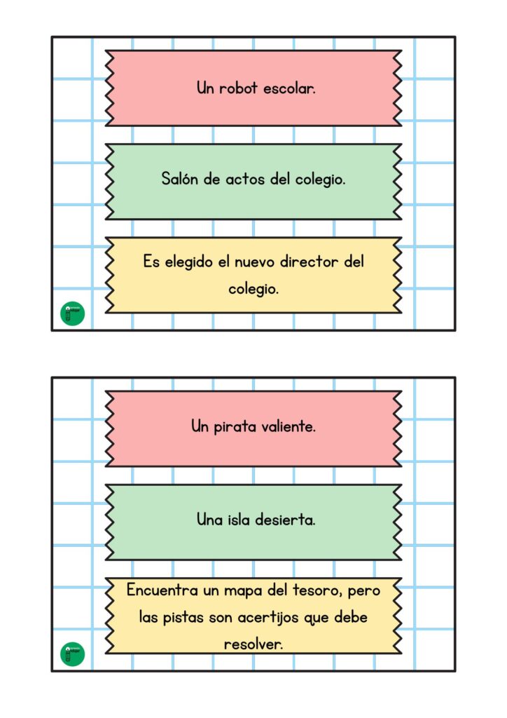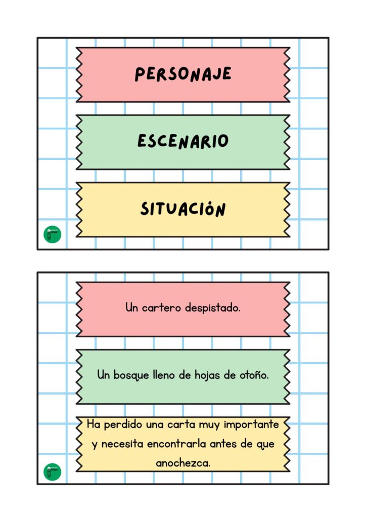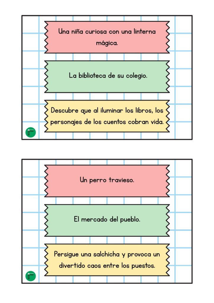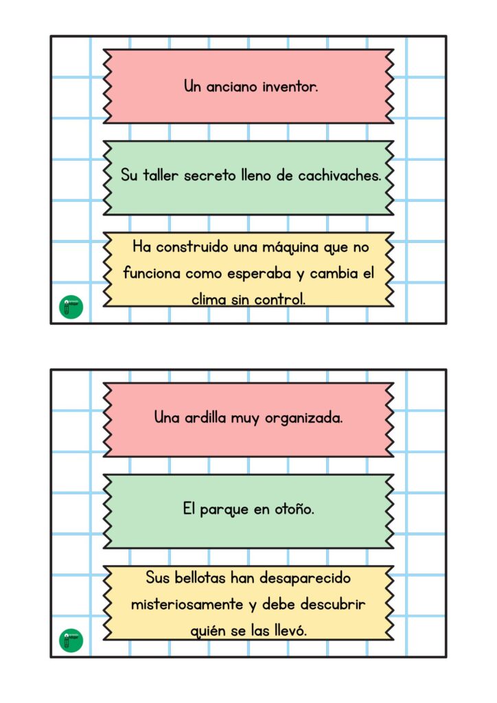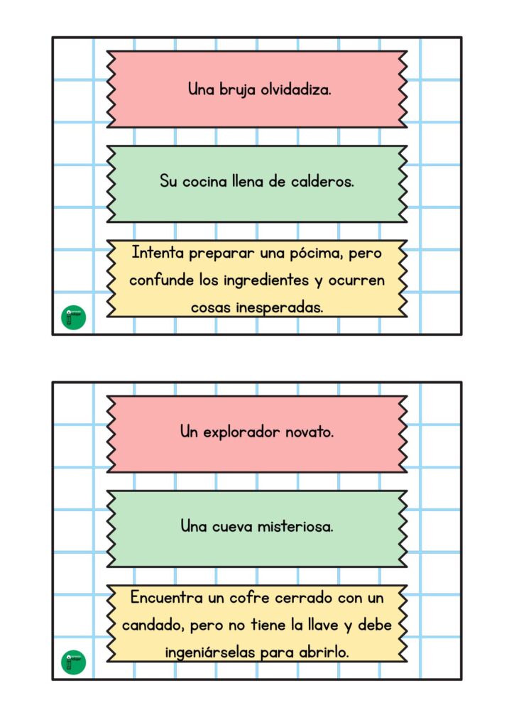 Estas tarjetas de escritura creativa convierten la tarea de escribir en una actividad lúdica y motivadora. Los alumnos no solo practican su redacción, sino que también desarrollan la capacidad de inventar, imaginar y expresarse libremente.