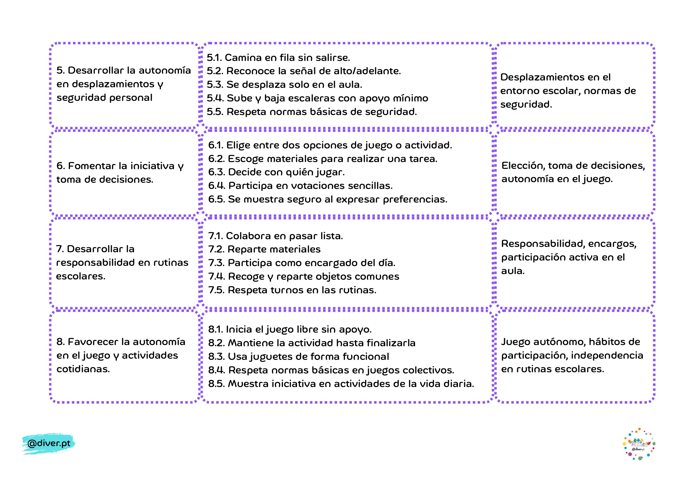 Objetivos e indicadores para la autonomía en alimentación, vestido y desvestido.