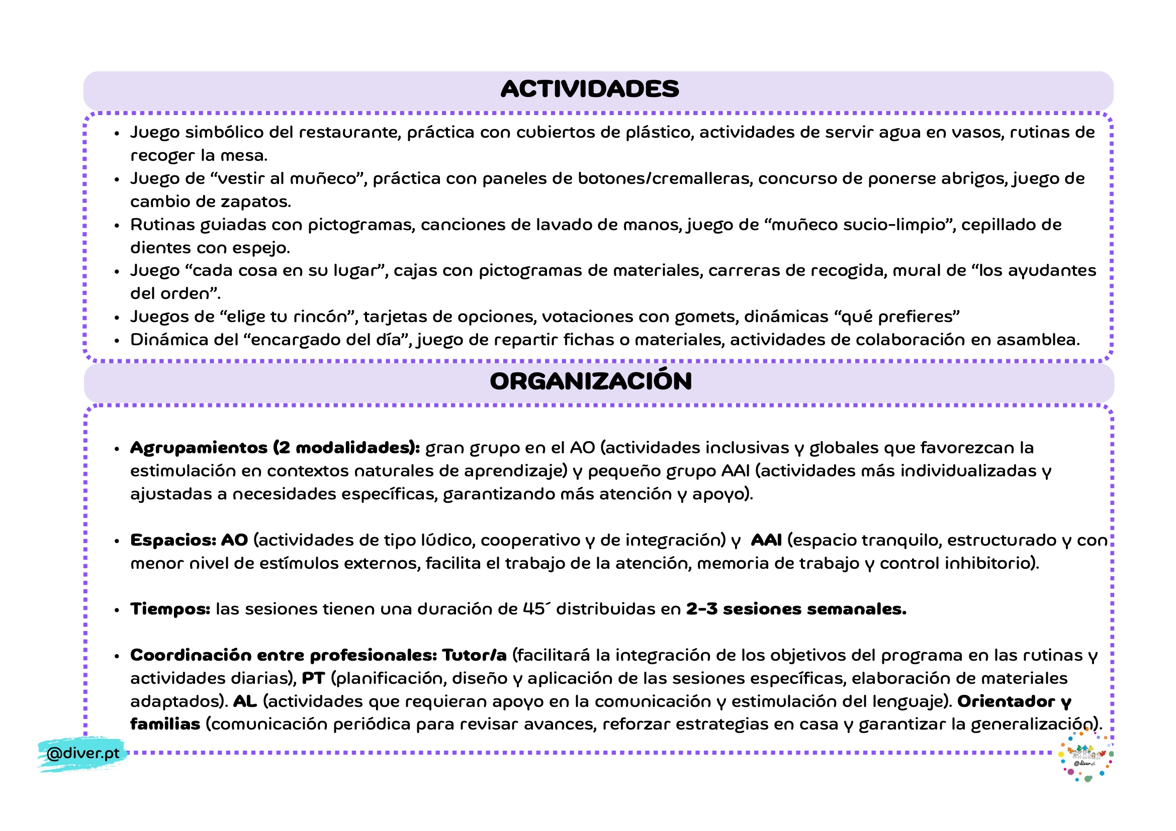 El programa puede aplicarse en aula ordinaria o en pequeños grupos, incorporando rutinas guiadas con pictogramas, juegos simbólicos, canciones y dinámicas cooperativas. Gracias a su enfoque práctico, permite que los niños desarrollen seguridad, responsabilidad y hábitos funcionales de forma progresiva.