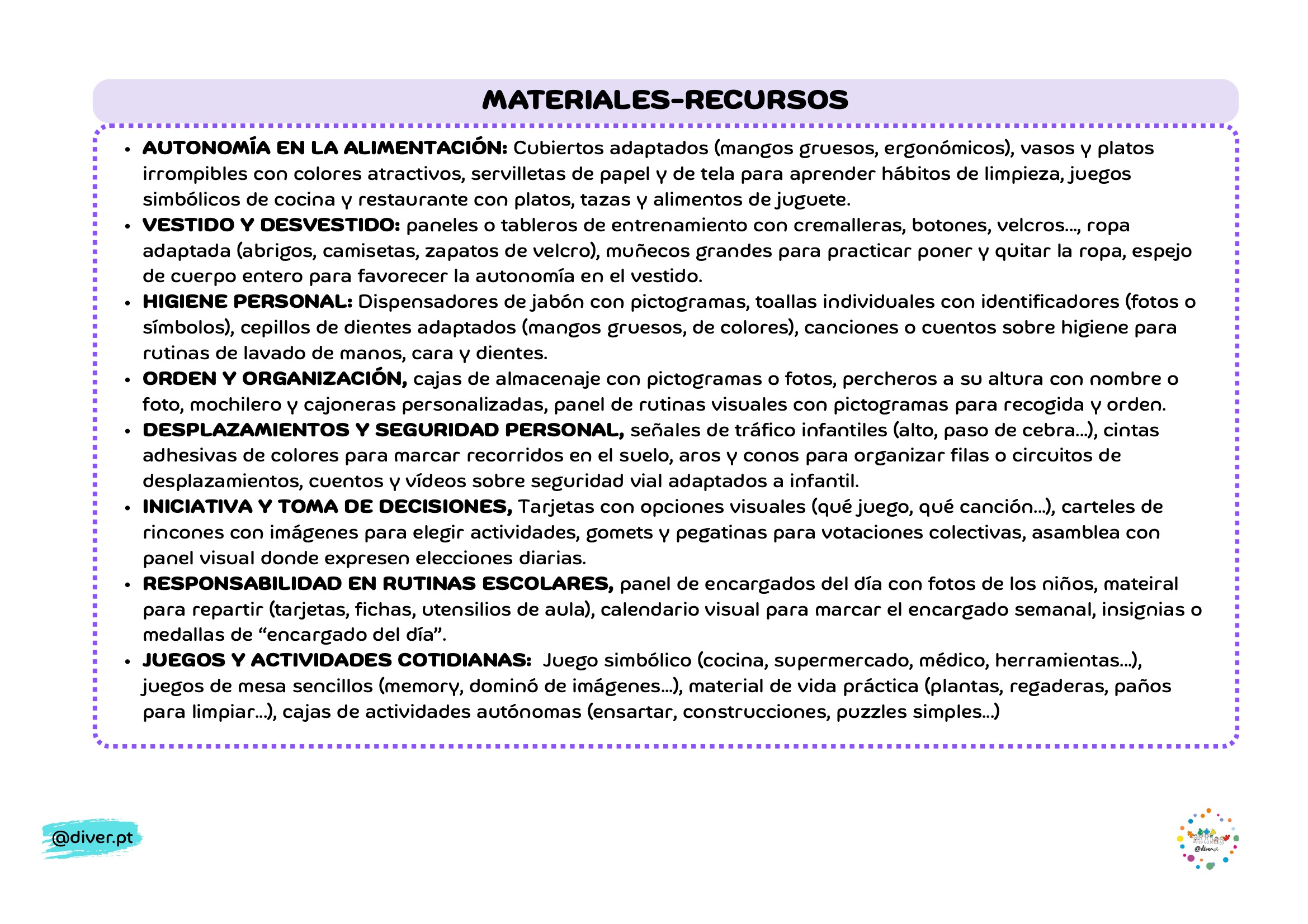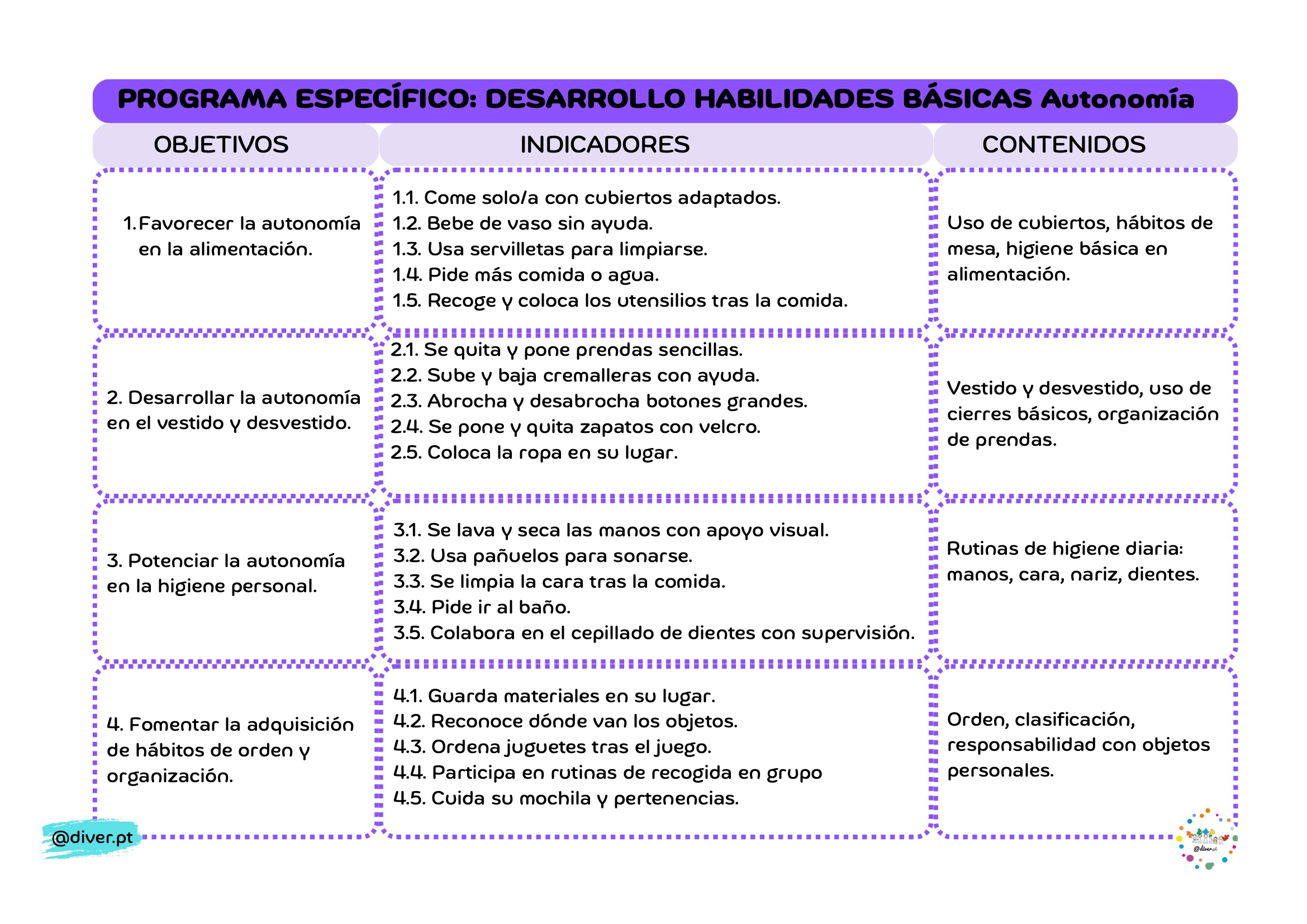 Hoy compartimos un recurso diseñado para trabajar la autonomía en la infancia. Este programa incluye actividades prácticas para fomentar la independencia en la alimentación, el vestido, la higiene, el orden, la seguridad y la toma de decisiones, facilitando la adquisición de rutinas esenciales para la vida diaria.