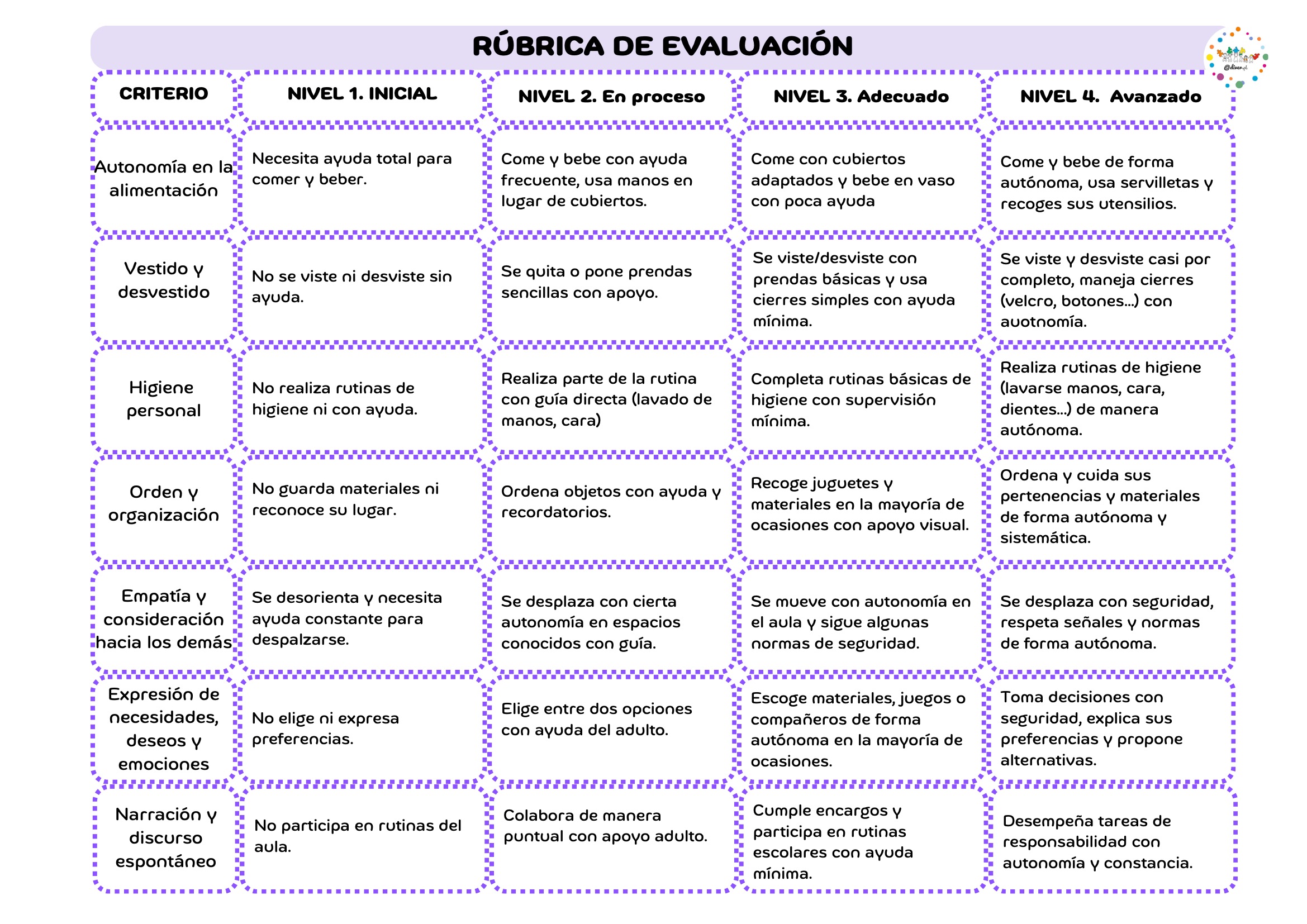 Rúbrica de evaluación con niveles de progreso en cada área de autonomía.